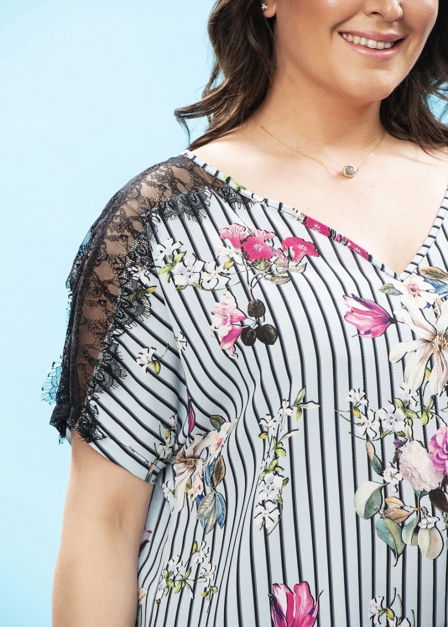 Çizgi üzerinde çiçek desenleri bu senenin kumaş trendleri arasındadır. Trendleri takip etmeyi sevenlerin de seveceği bir üründür, Dantelli Çiçek Desenli Büyük Beden Bluz.