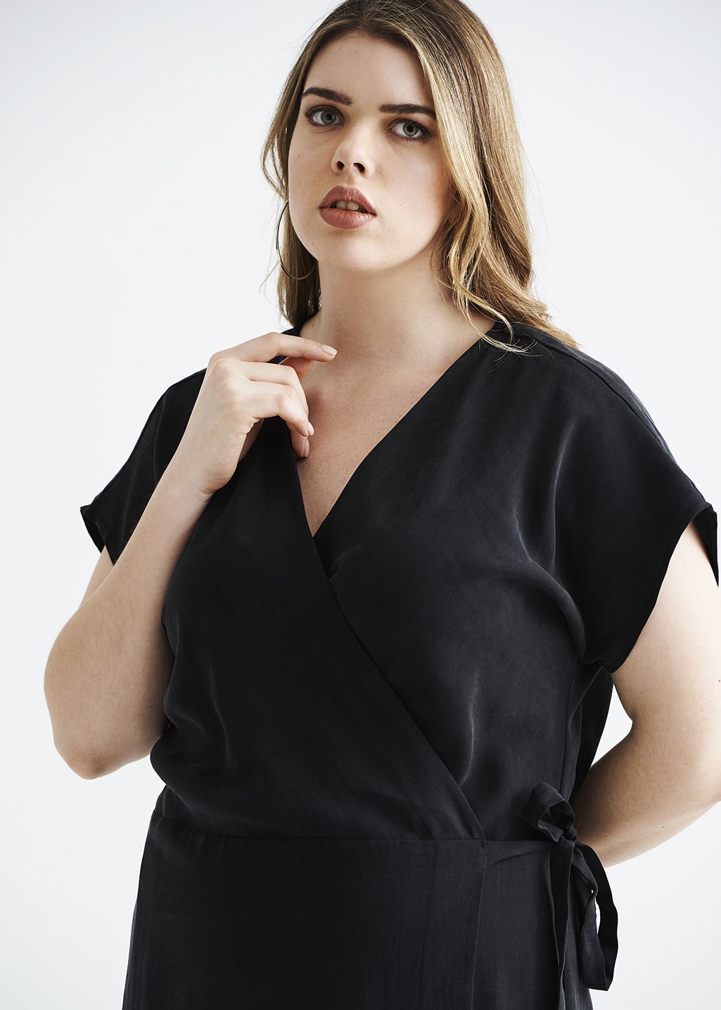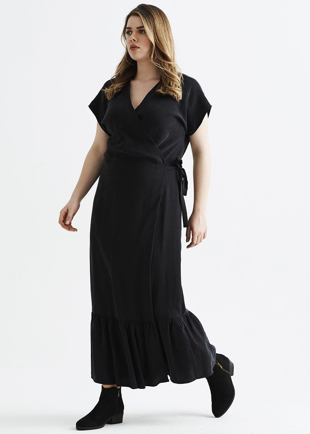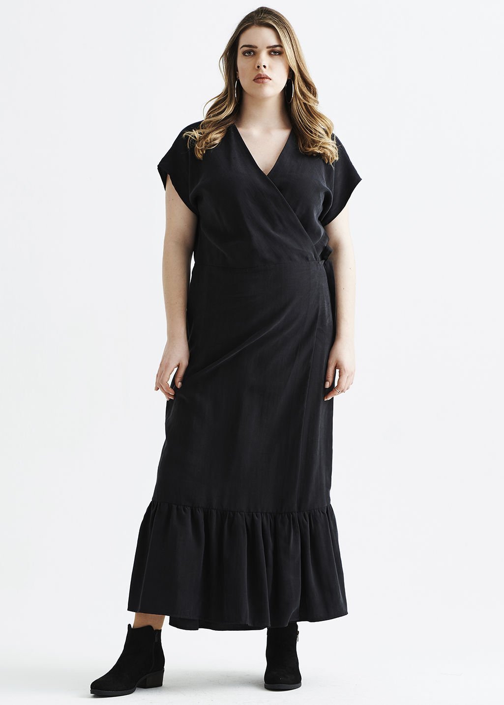 Eteği Büzgülü Kruvaze Viskon Siyah Büyük Beden Elbise