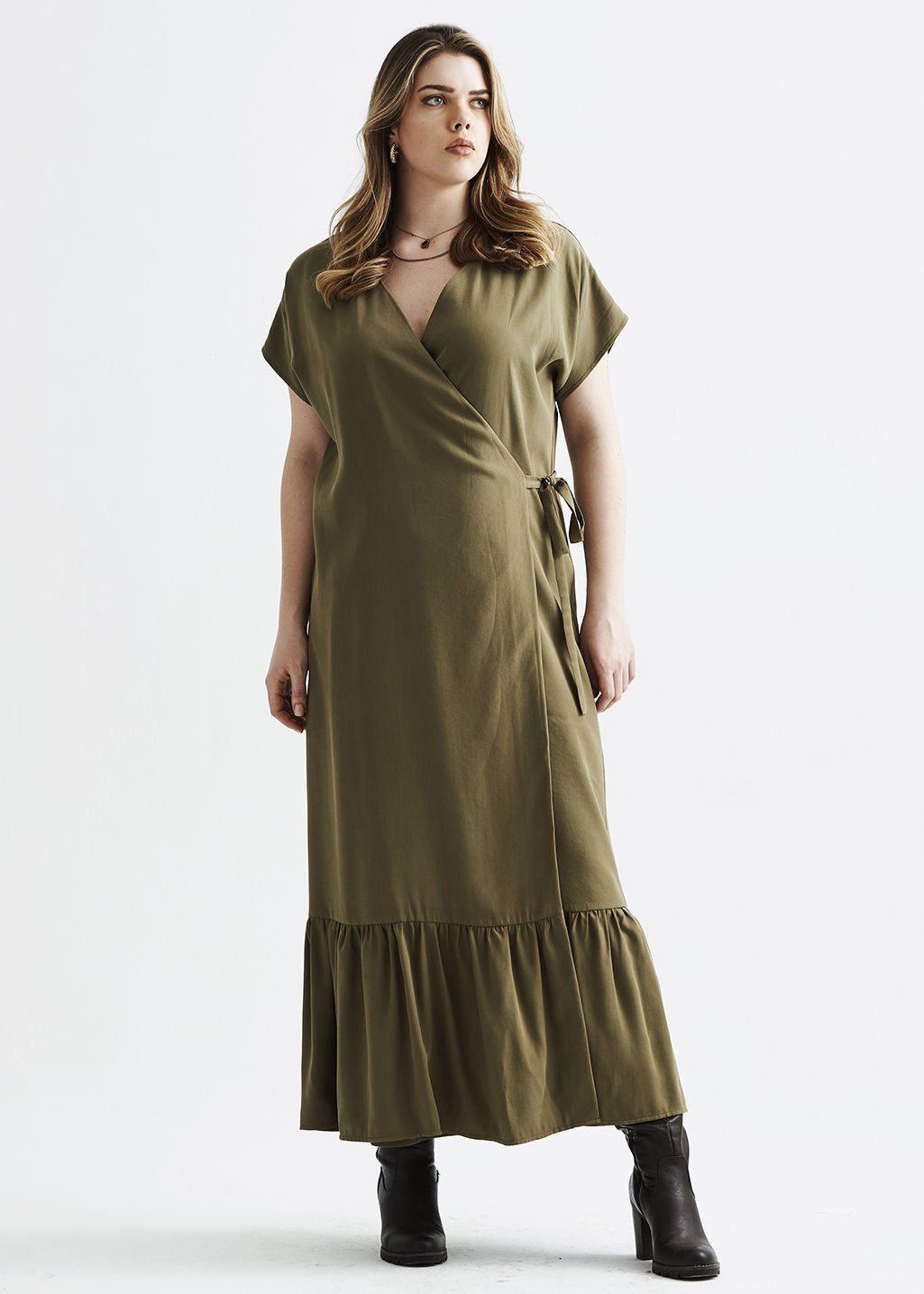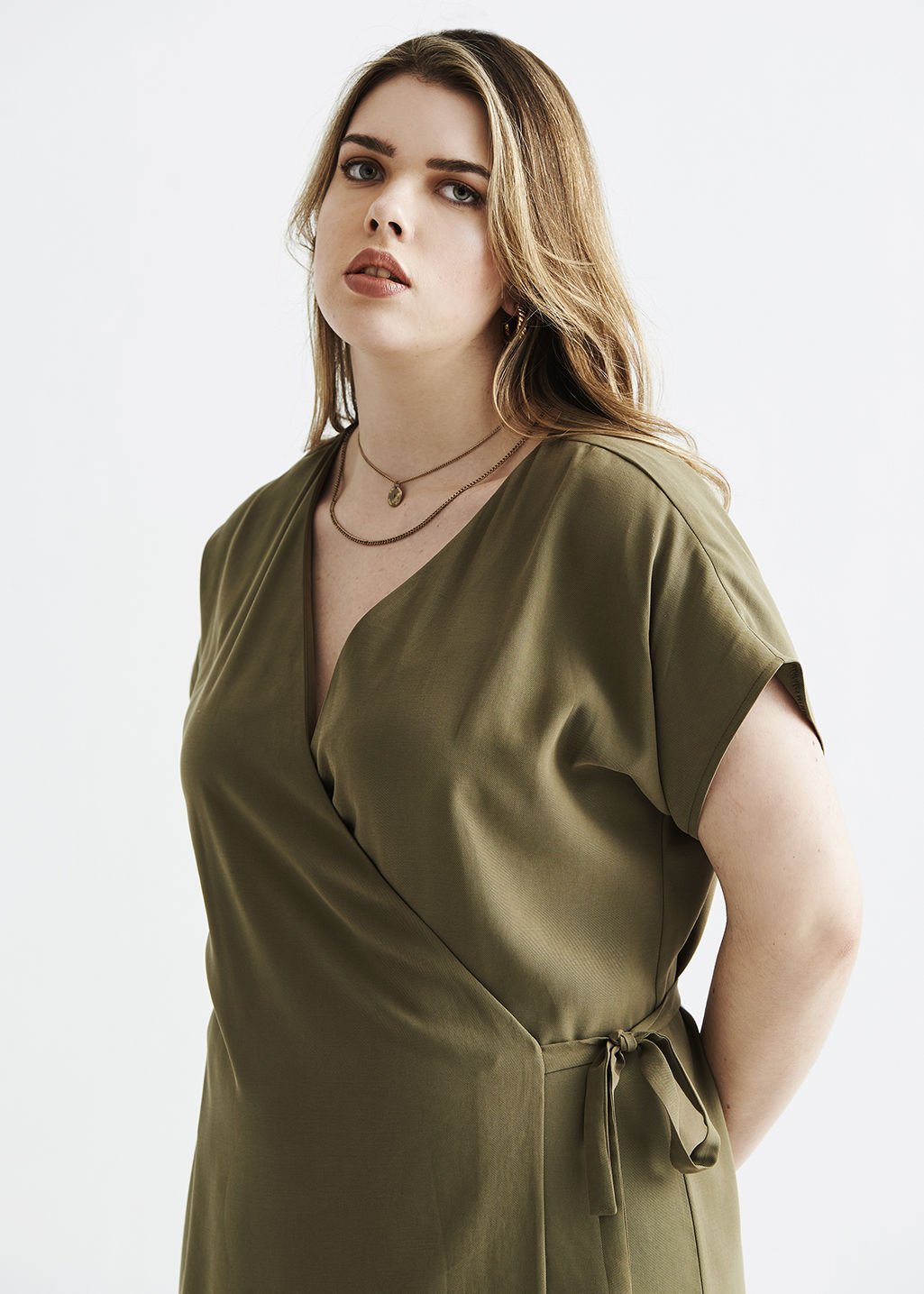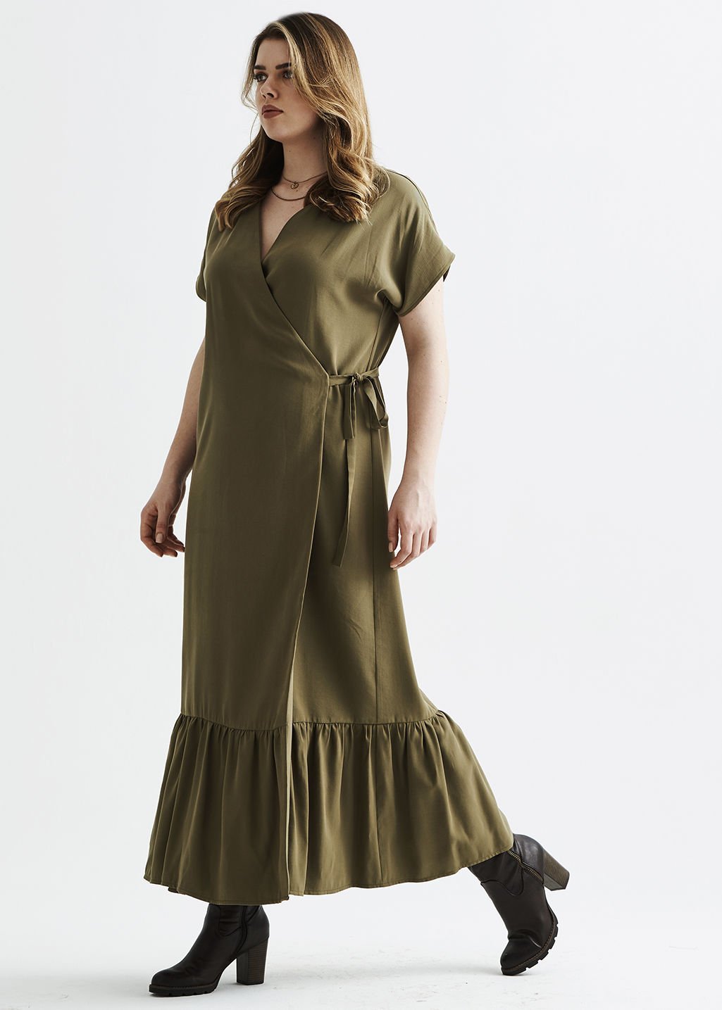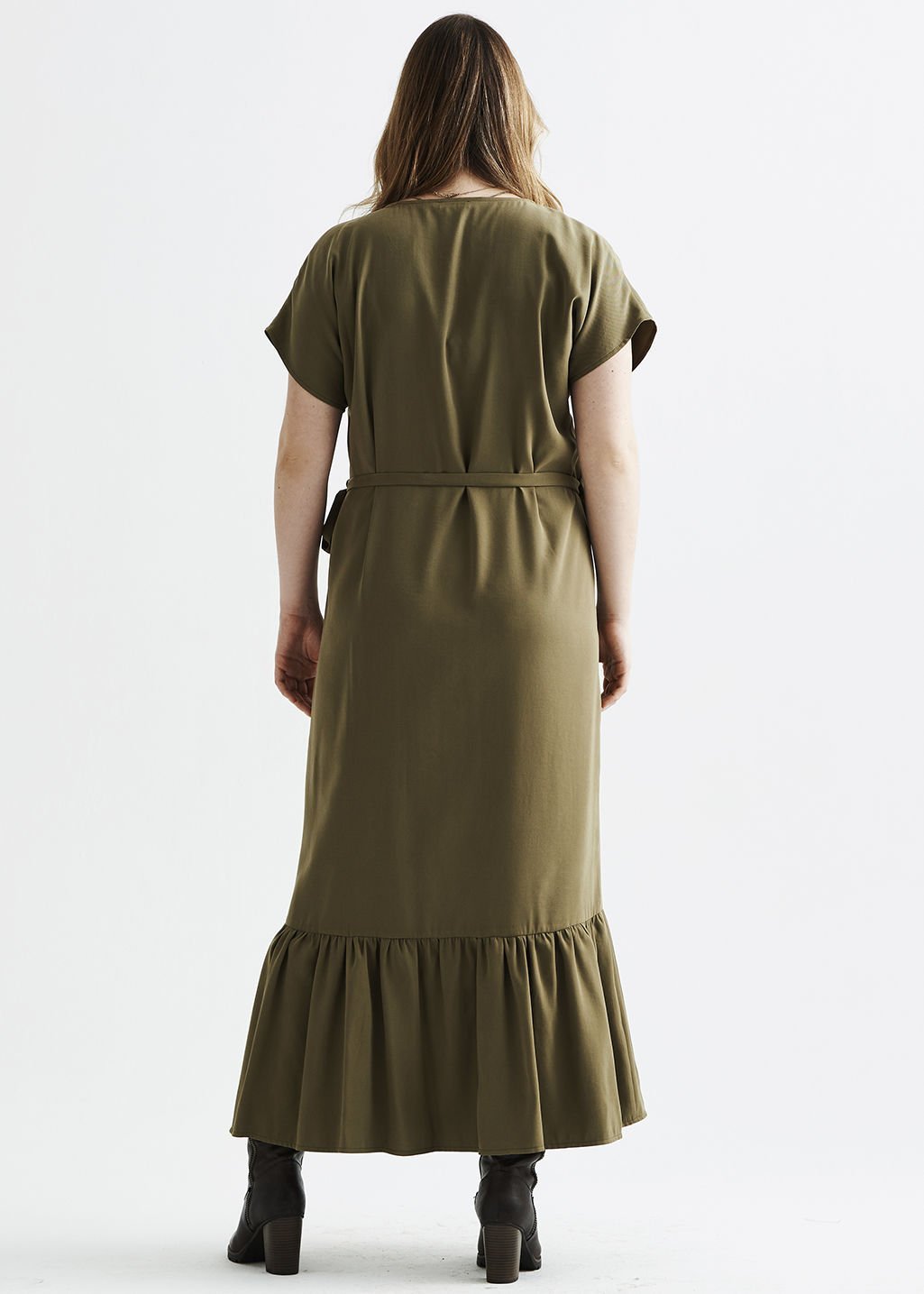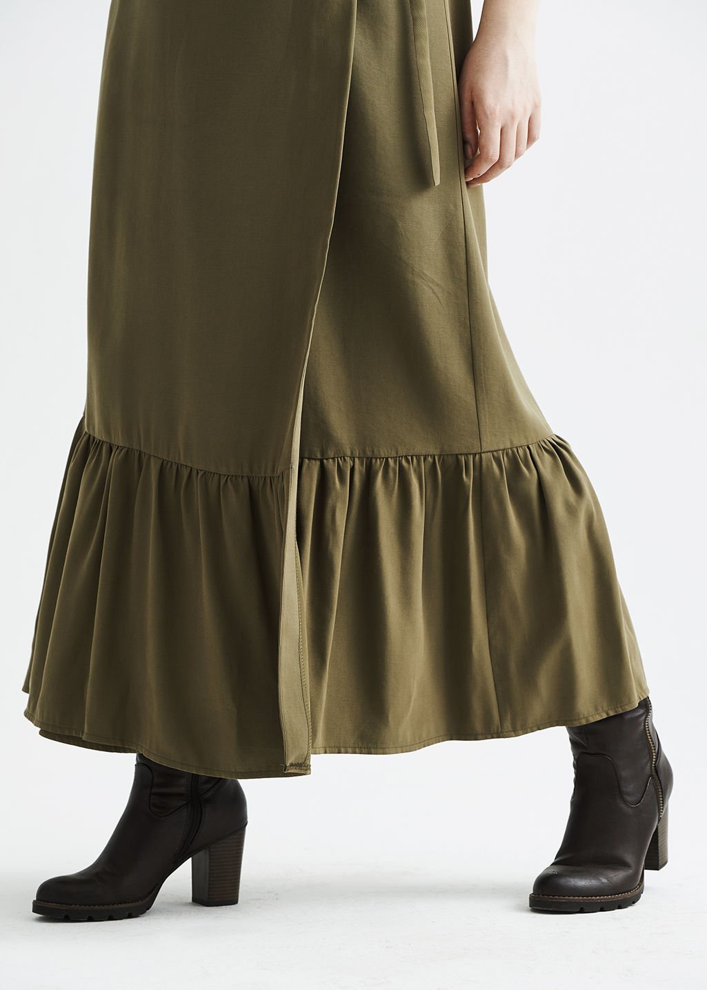 4.Eteği Büzgülü Kruvaze Viskon Haki Büyük Beden Elbise