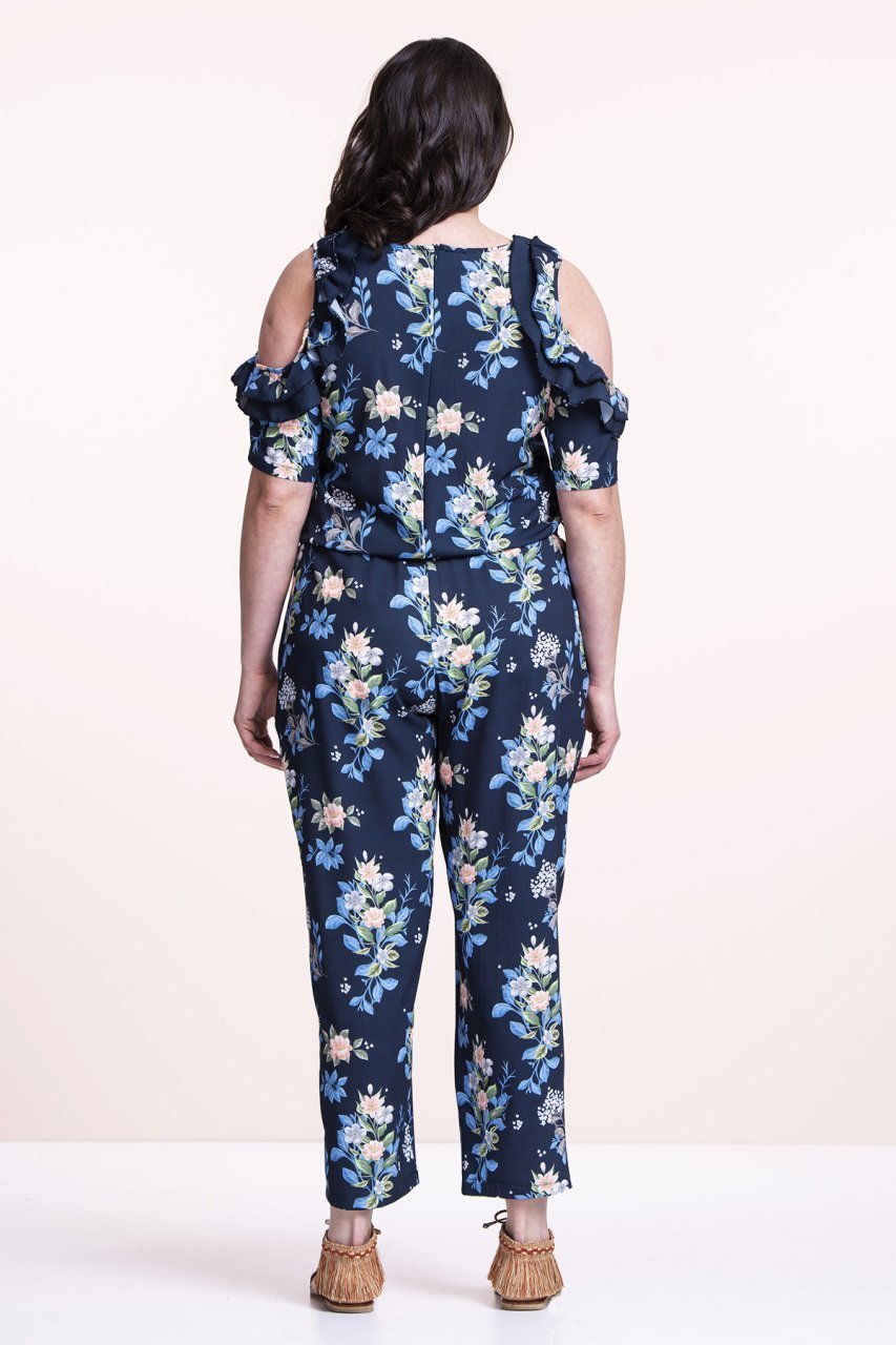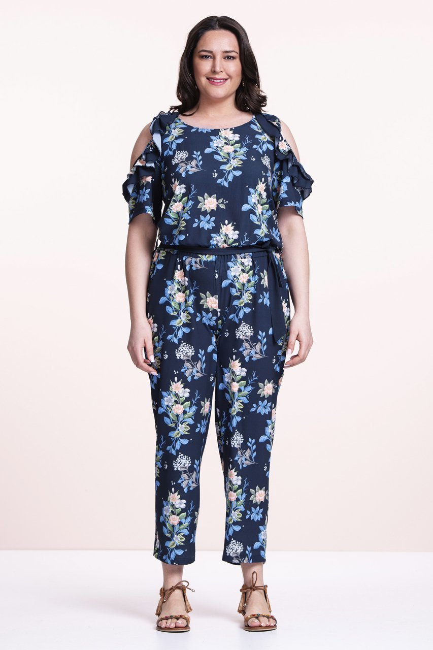 Lacivert Çiçekli Krep Büyük Beden Tulum 46 Beden
