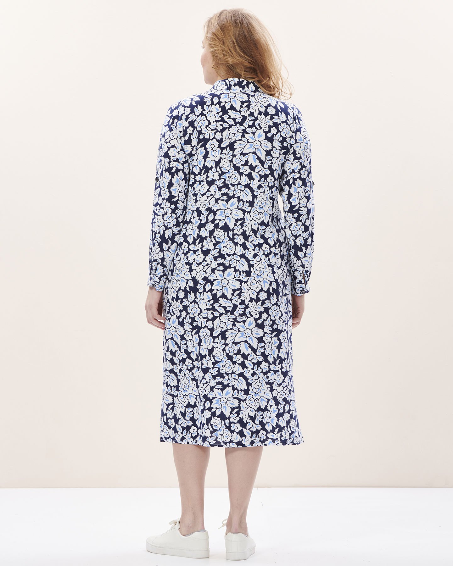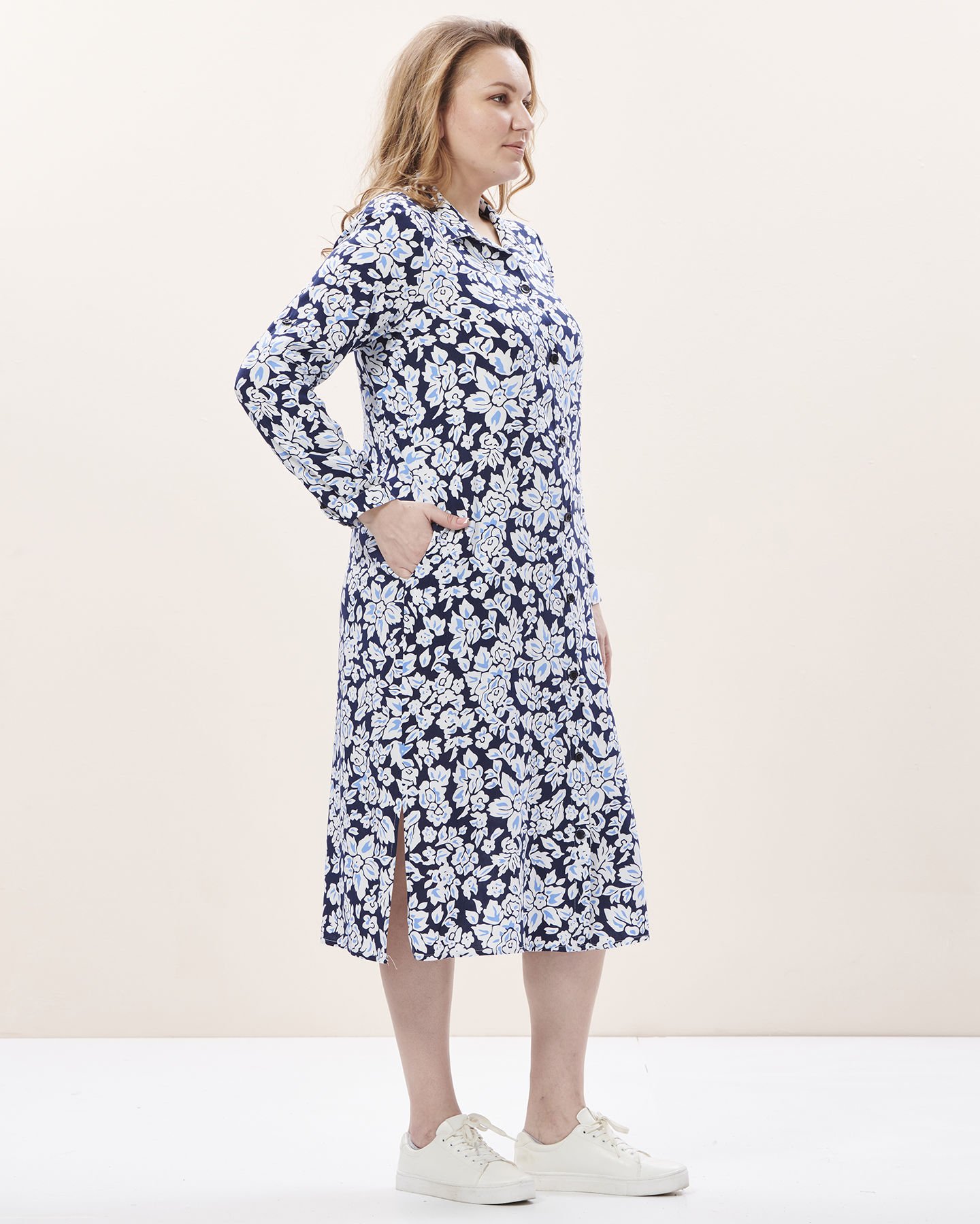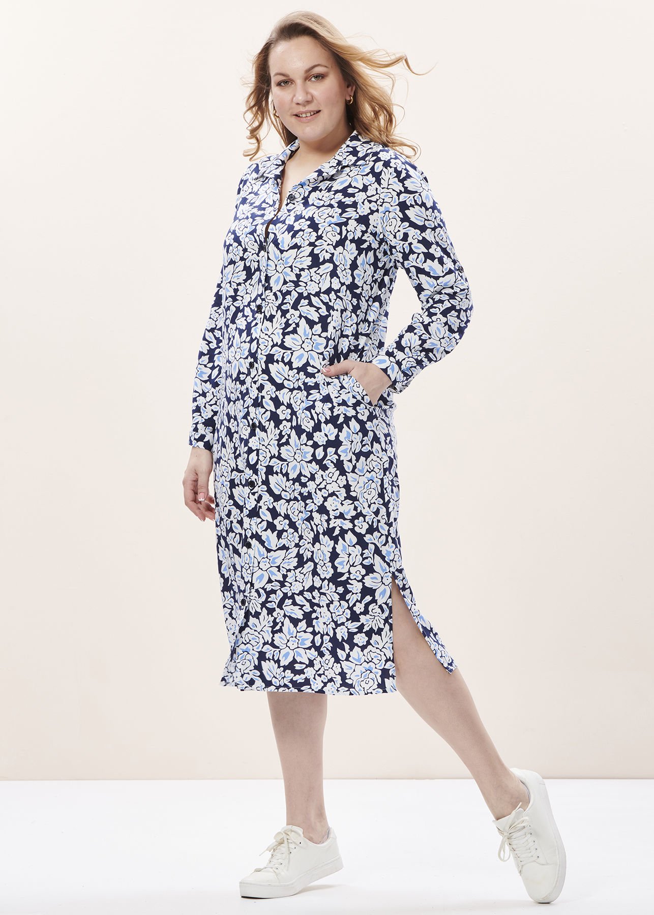 4.Mavi Çiçek Desenli Cepli Büyük Beden Gömlek Elbise Boyu 125cm