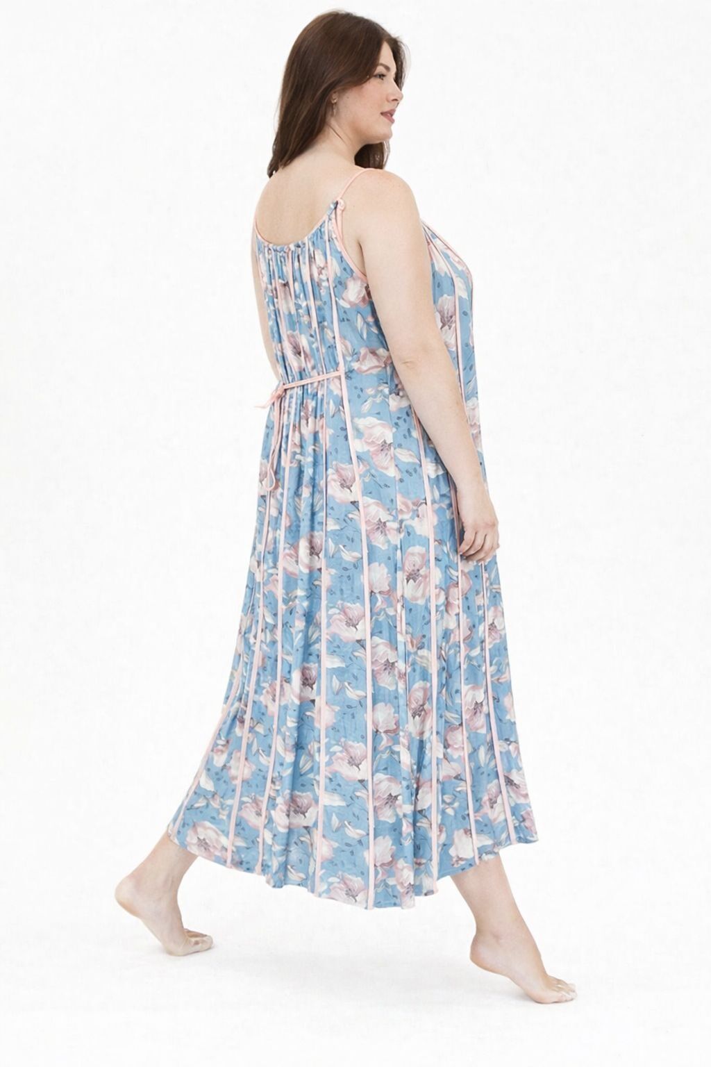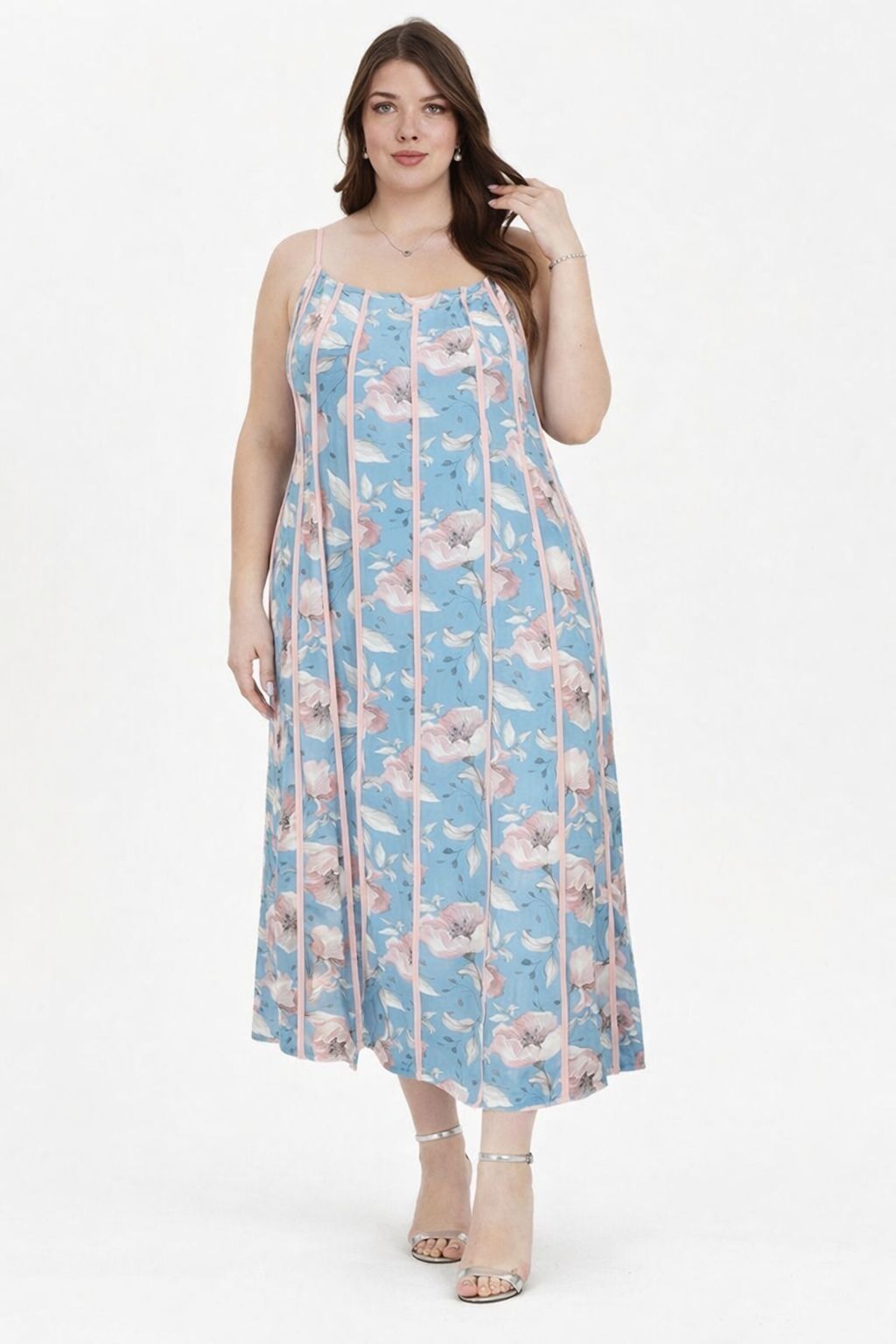 5.Mavi Çiçekli Krep Askılı Büyük Beden Elbise Boyu: 125cm