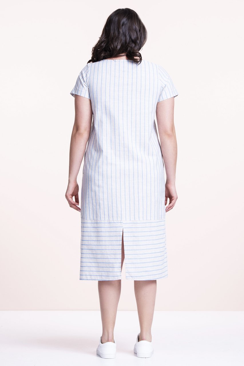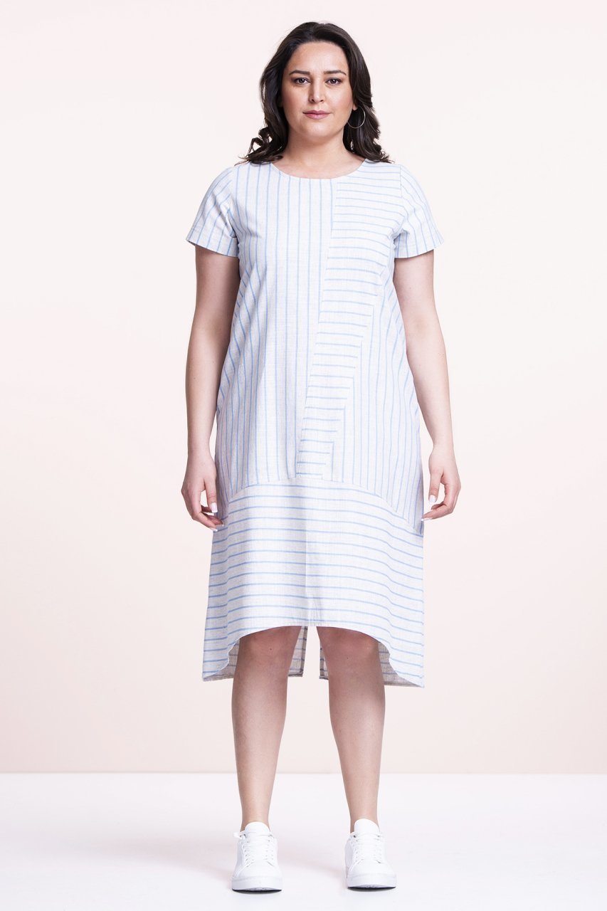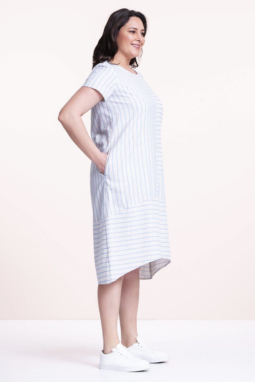 Mavi Çizgili Spor Keten Büyük Beden Elbise