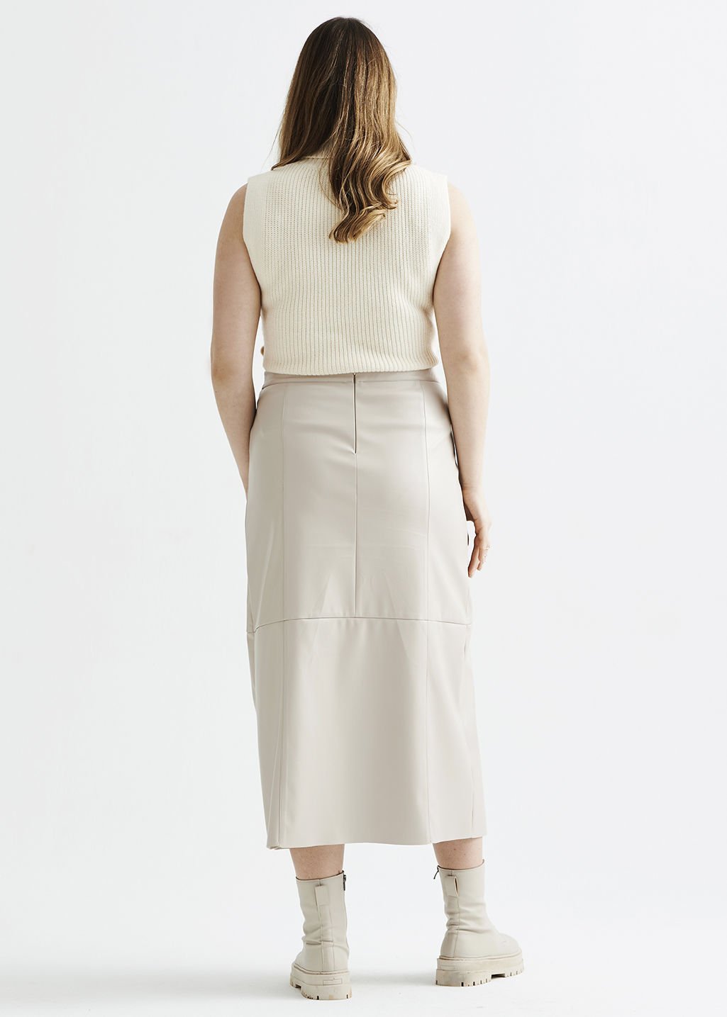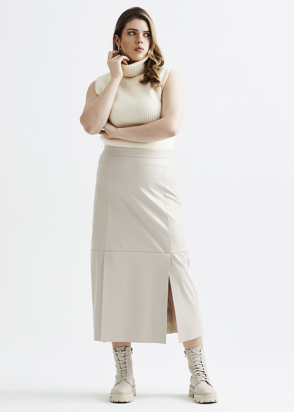 Ekru Önden Yırtmaçlı Büyük Beden Suni Deri Etek
