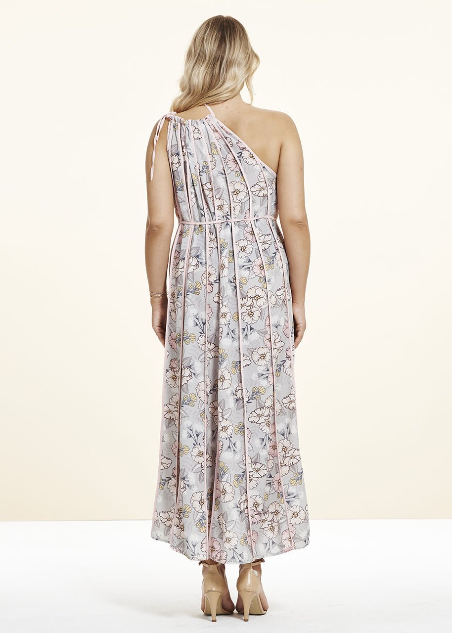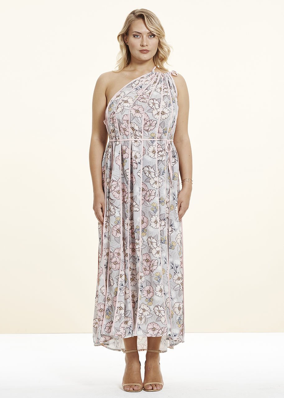 Pudra Çiçek Baskılı Tek Omuzlu Büyük Beden Elbise