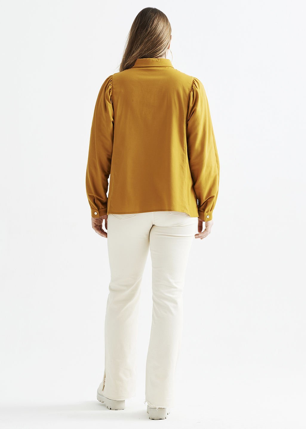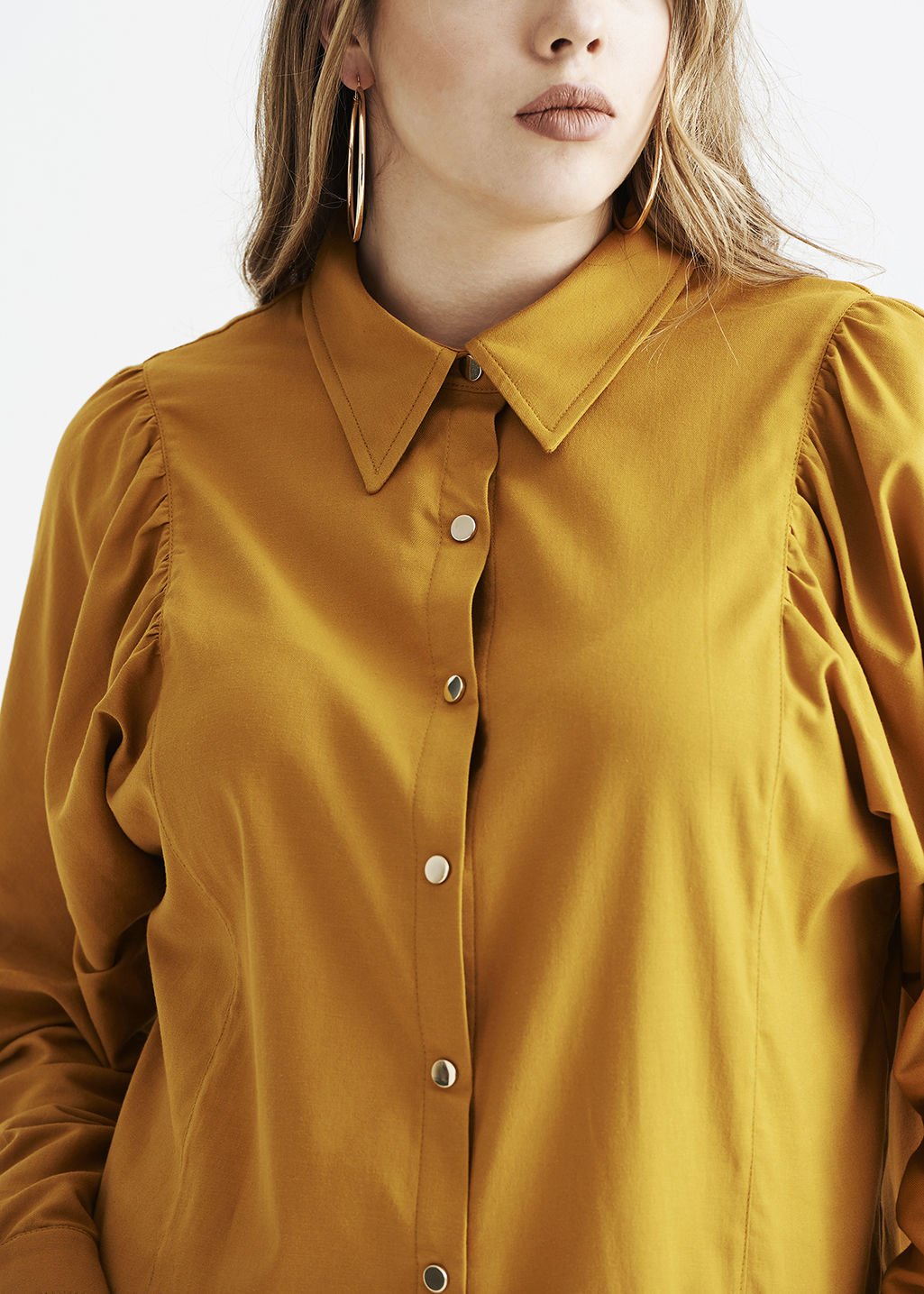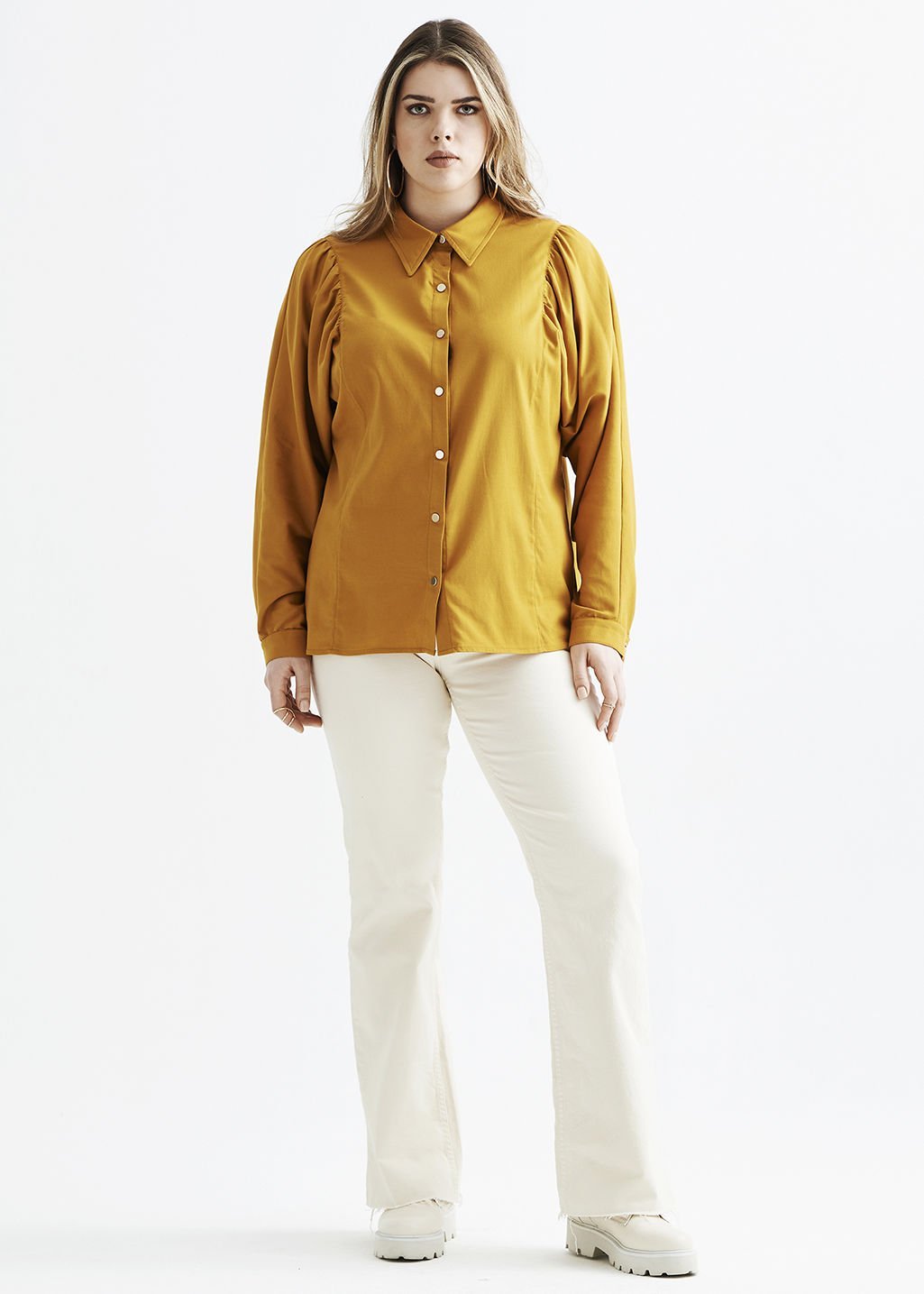 Safran Omuz Büzgülü Büyük Beden Viskon Gömlek