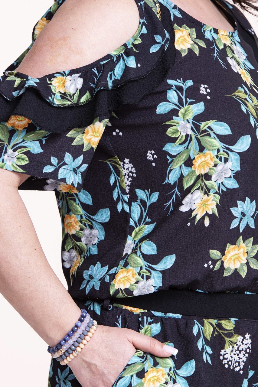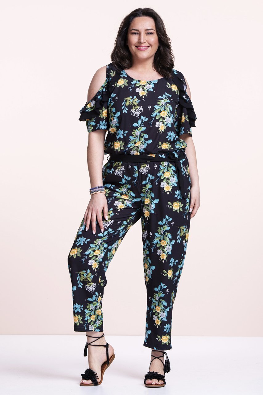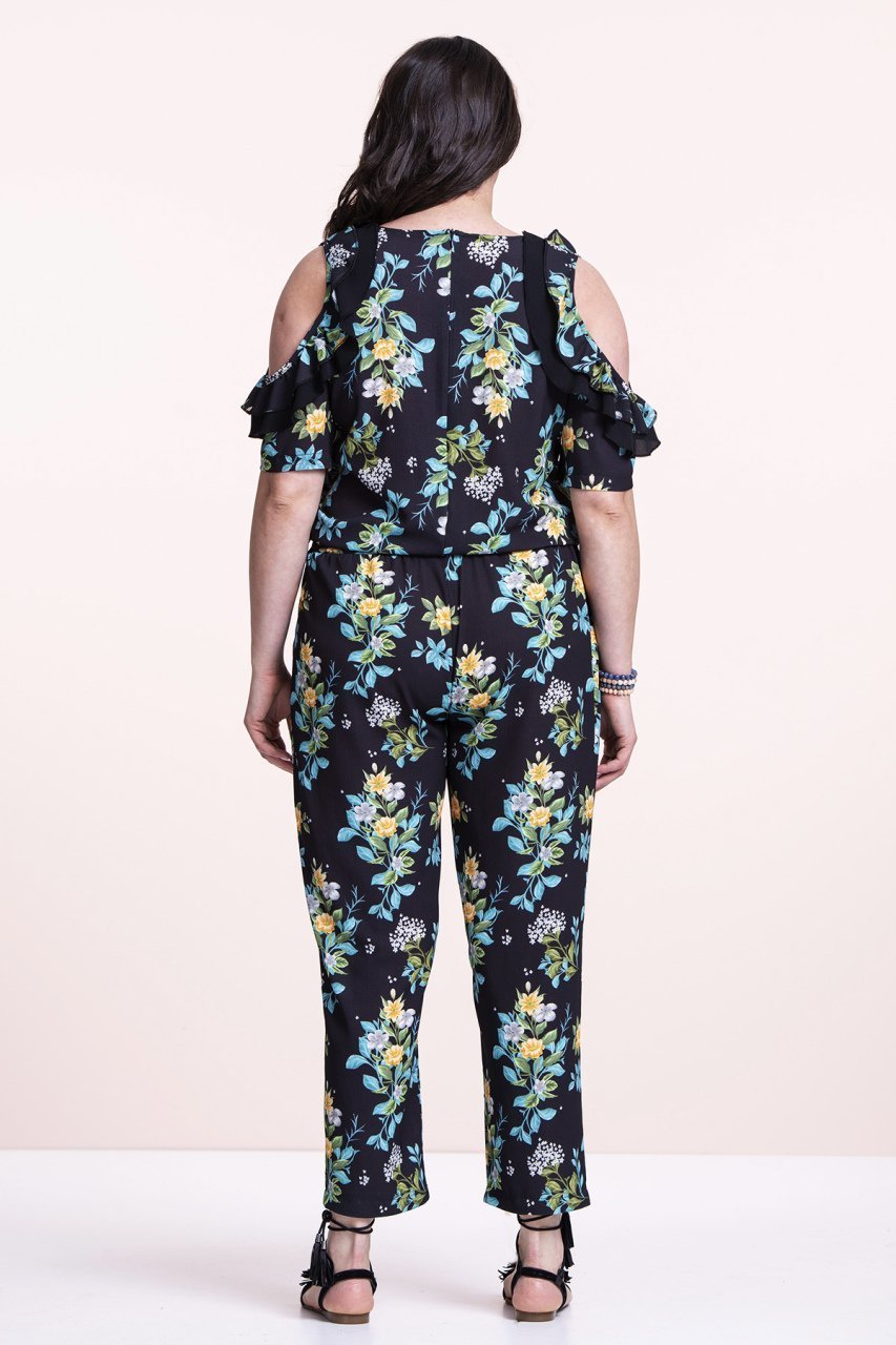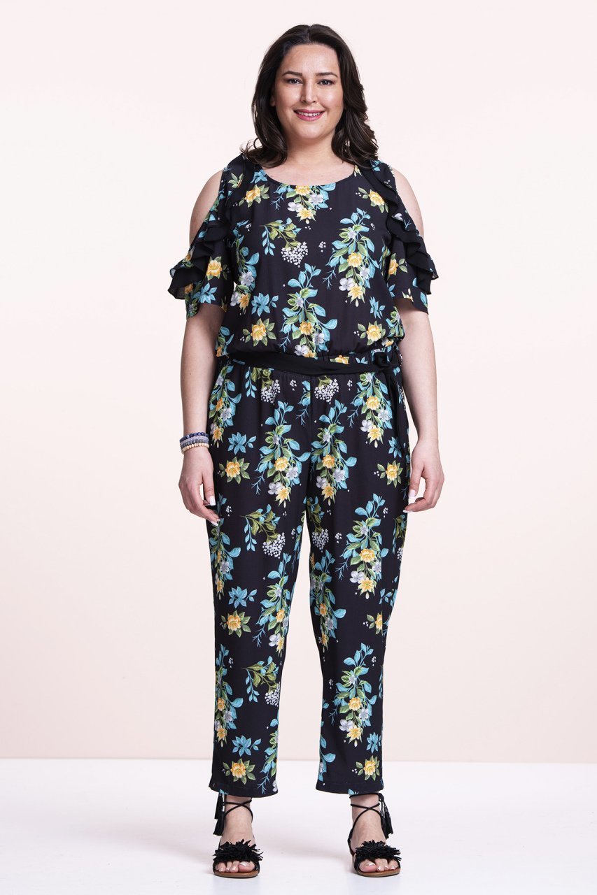 Siyah Çiçekli Krep Büyük Beden Tulum 50 Beden