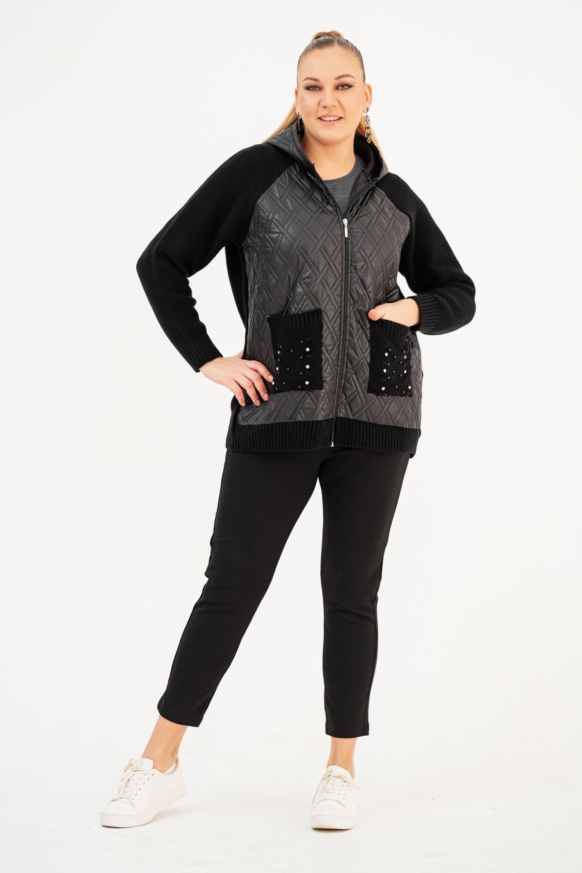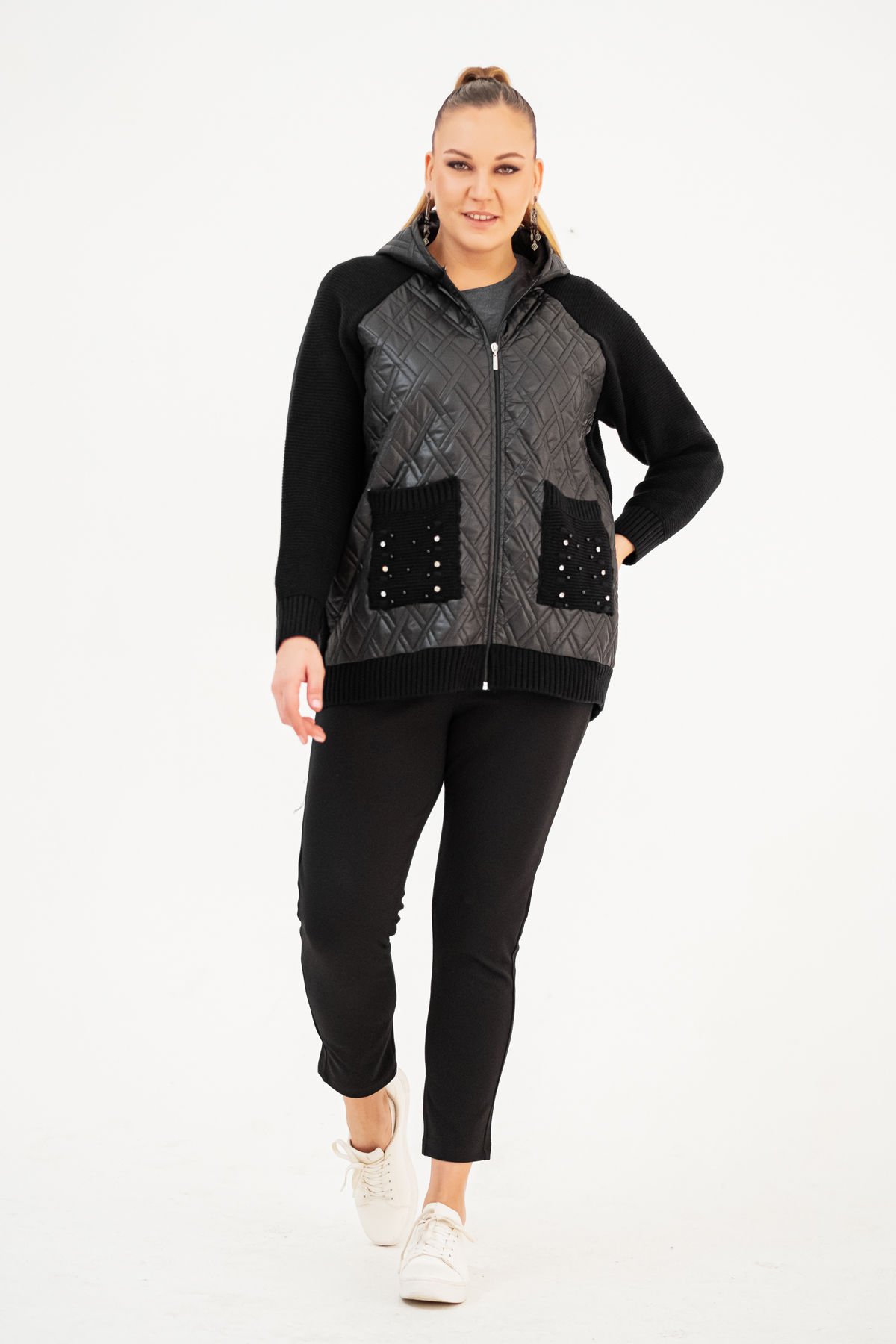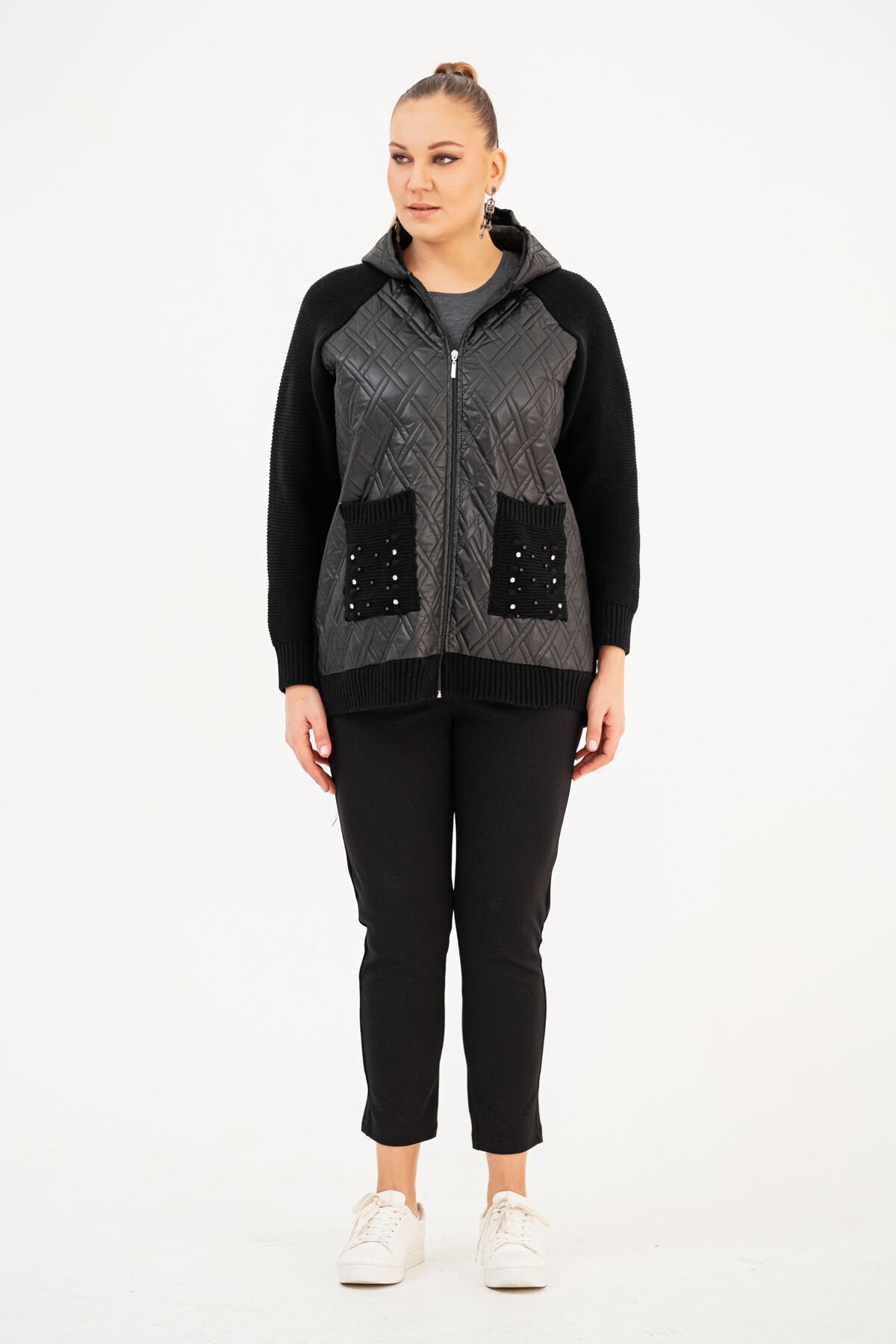 Siyah Kapitoneli Kapşonlu Büyük Beden Ceket