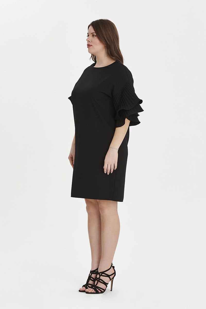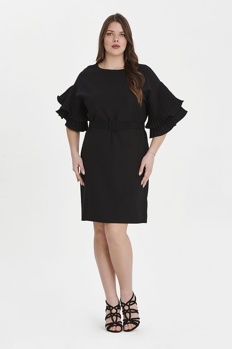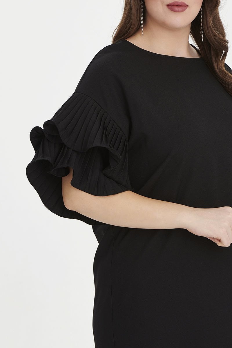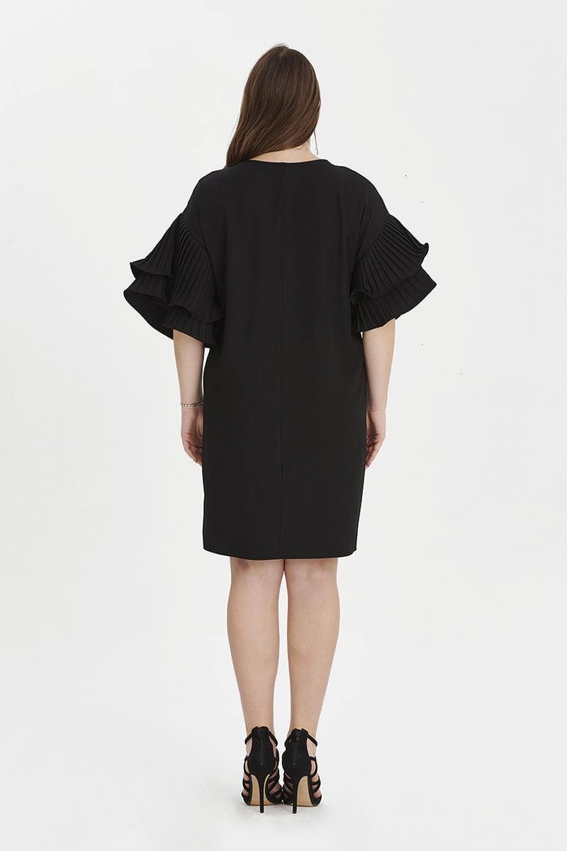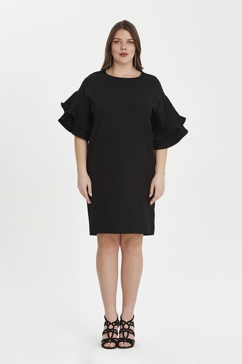 Siyah Kolu Volanlı Midi Büyük Beden Elbise
