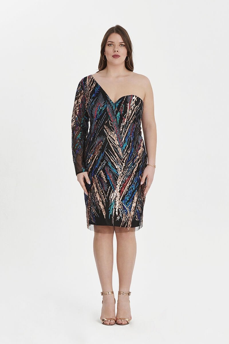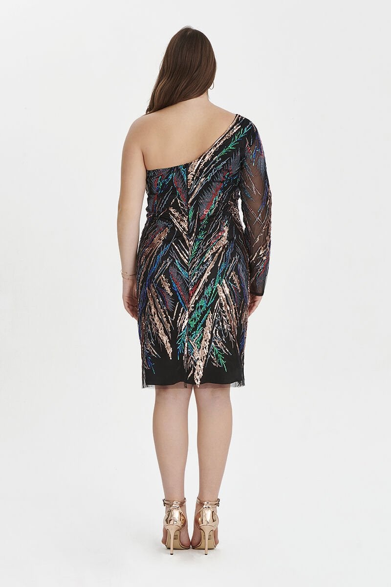 Tek Omuz Tül Renkli Payet İşlemeli Büyük Beden Abiye Elbise