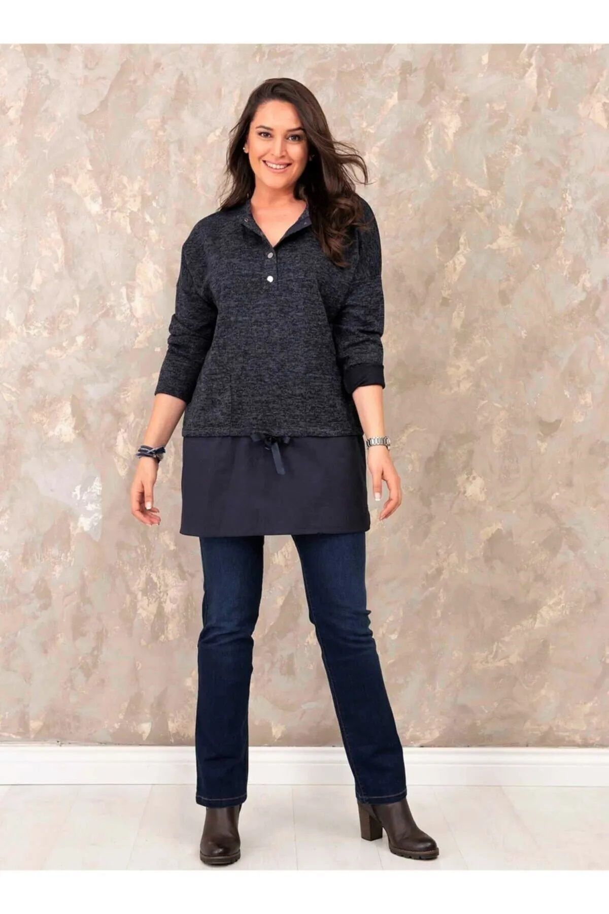 Yakası Çıtçıtlı Büyük Beden Bluz, yumuşak ve esnek kumaşı ile son derece rahat bir büyük beden giyimdir. Örme kumaş altına dikilen gömlek kumaşı poplin ile, kazak altına gömlek giyilmiş havası kazandırılmıştır.