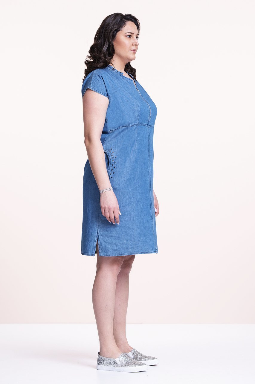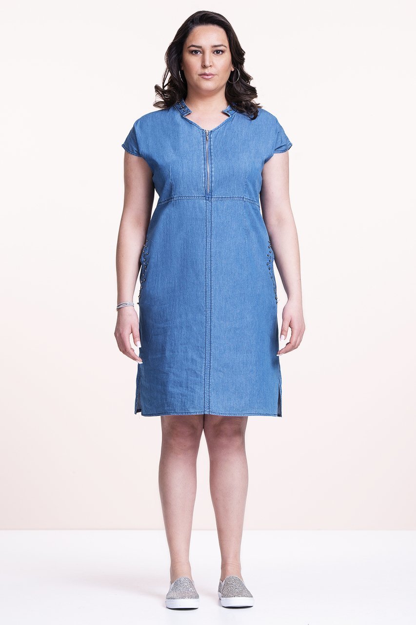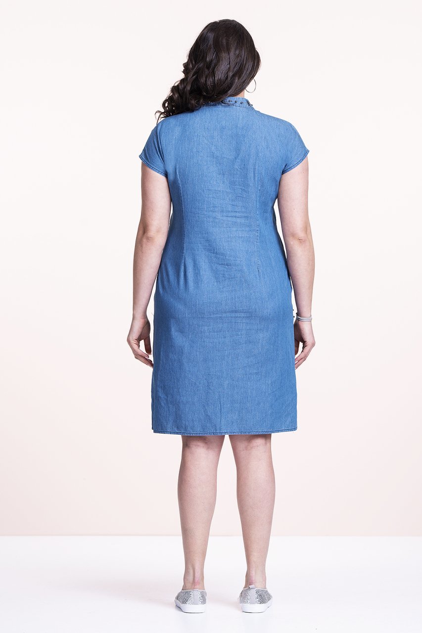 Yakası Taşlı Kot Büyük Beden Elbise